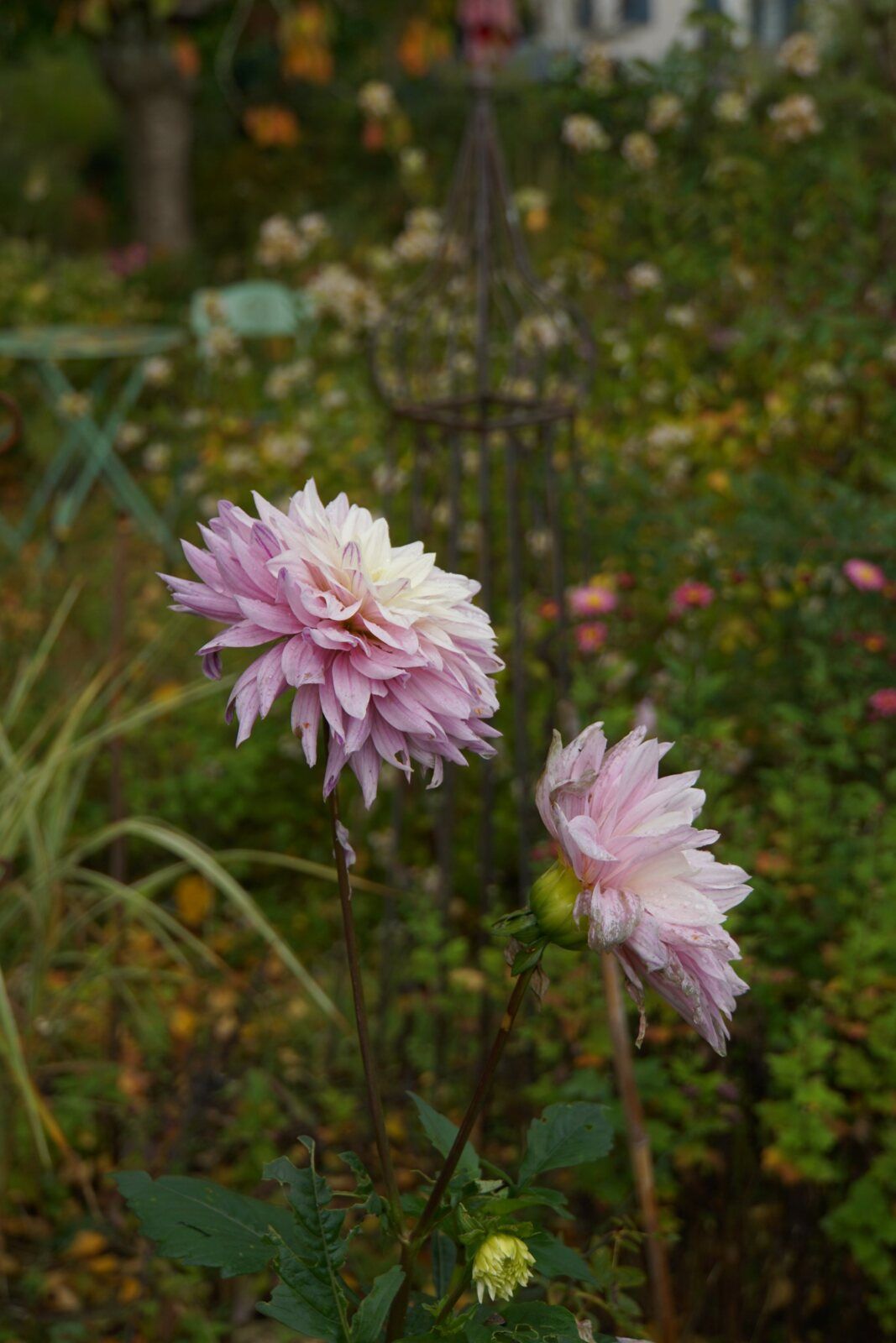 Pendant que je profitais du soleil du sud, l'automne s'installait dans mon jardin. La pluie et le vent ont précipité les feuilles à terre. Les asters sont complètement défleuris et ils vont désormais se ressemer aux 4 vents. Les derniers dahlias courbent leur lourde tête gorgée d'eau. Je cueille les derniers pour un tout petit bouquet. Les chrysanthèmes ont commencé leur floraison mais beaucoup sont irrésistiblement attirés vers le sol.