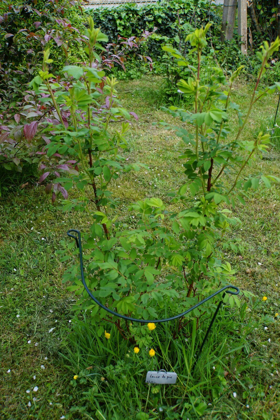 Et puis, en plein milieu, pour attirer le regard il y a le rosier "Lasse de Pic'. Planté il y a 2 ans maintenant, je pense qu'il va commencer à m'offrir des fleurs. J'attends beaucoup de lui pour occuper ce bel espace. On voit qu'à partir de l'endroit où je l'ai taillé, il a de beaux départs.