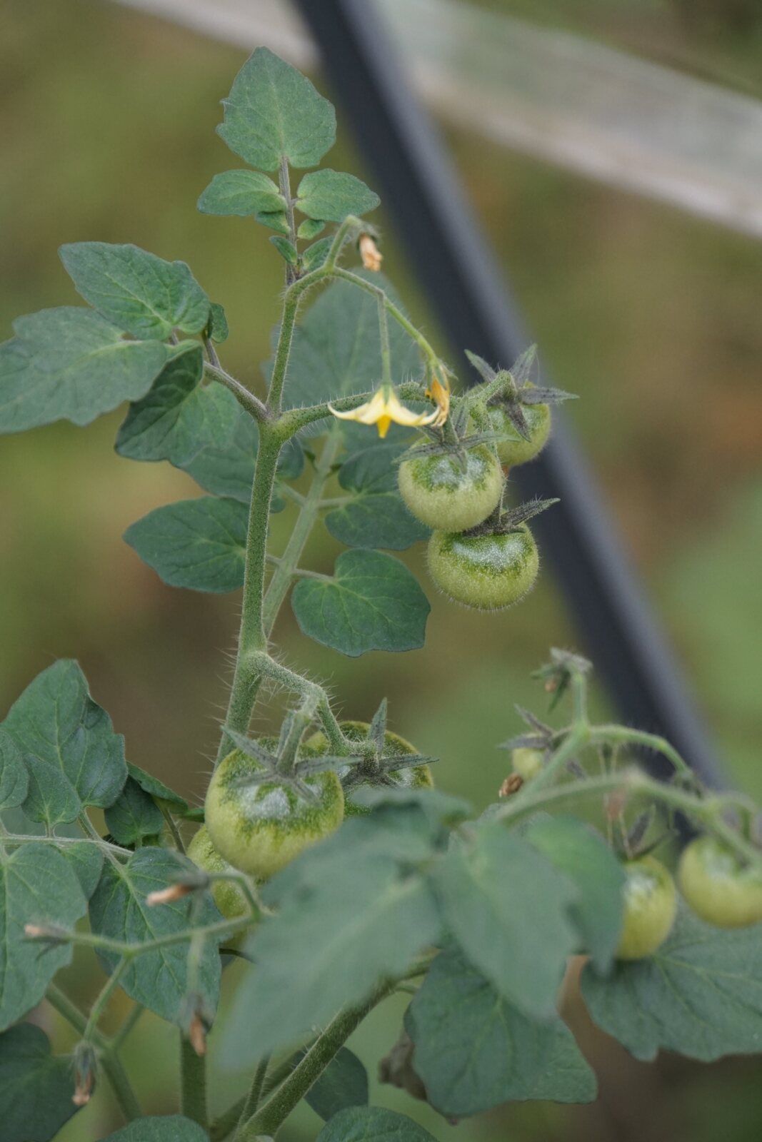 En m'approchant un peu de ce qui reste de mes pieds de tomates. Je remarque que les tomates cerises m'offrent quelques gourmandises et que les autres ont des fleurs. Pft ! Cet été, les fleurs avaient séchées et je n'ai pas eu une seule tomate.