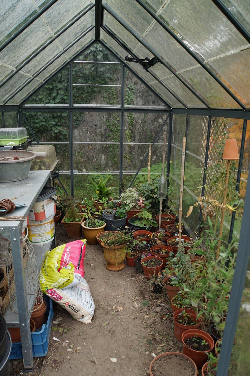 J'ai installé mes jeunes boutures dans la serre froide. Les plantes les plus frileuses comme le pélargonium ira bientôt rejoindre le garage-atelier. Il n'est pas chauffé non plus mais la construction en parpaing sera plus confortable.